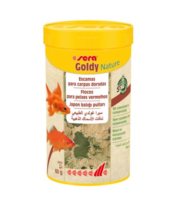 Sera Goldy Nature é o alimento base para pequenos peixes vermelhos e as suas variedades de criação, tais como p. ex. Shubunkin, Cauda-de-Véu ou Sarasa e outros peixes de água fria, sem corantes nem conservantes.