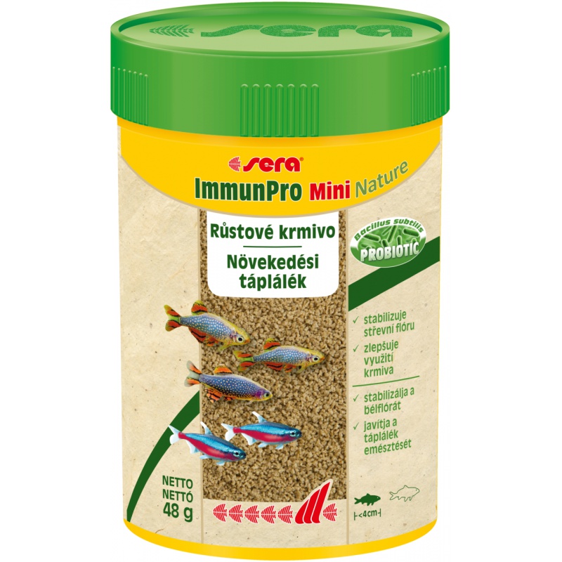 Sera ImmunPro Mini é um alimento destinado à utilização na criação, que se afunda lentamente, para todos os peixes ornamentais até 4 cm.