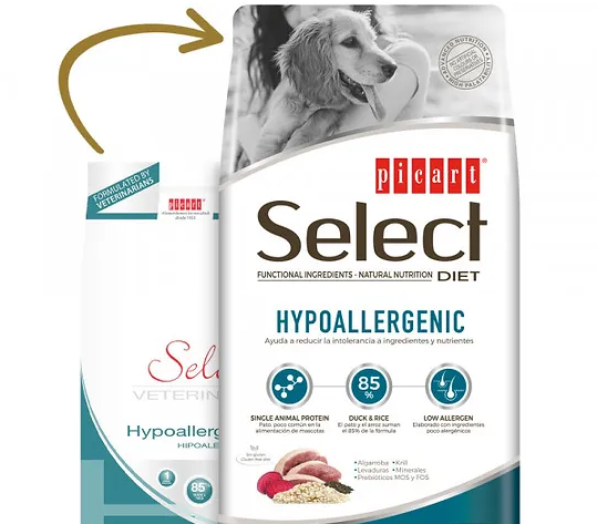 A fórmula Picart Select Diet HYPOALLERGENIC é geralmente bem tolerada porque está composta 85% pelos ingredientes principais: o pato como primeira e única fonte de proteína, e o arroz, como principal fonte de hidratos de carbono, o que favorece uma baixa alergenicidade do produto