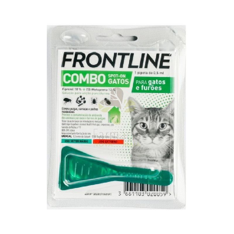 Frontline Combo pode ser usado para a eliminação de pulgas e contra novas infestações de pulgas adultas por 4 semanas (para gatos) e 8 semanas (para cães), para a prevenção da multiplicação de pulgas, inibindo o desenvolvimento de ovos, larvas e pupas originários de ovos postos por pulgas adultas por 6 semanas após a aplicação e a eliminação de carrapatos por até 2 semanas e piolhos mordedores. Frontline Combo Spot On pode ser usado como parte de uma estratégia de tratamento para o controle da dermatite alérgica à pulga (FAD)